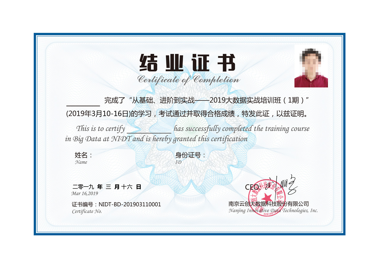 【可选】由知名的Silicon Stone Education(SSE,硅石教育集团)颁发的国际大数据人才认证证书(需要通过在线考试,学员可在报到时选择是否进行证书考试报名,报名的学员将按照900元/人缴纳证书工本费,并在考试合格后获得证书)。