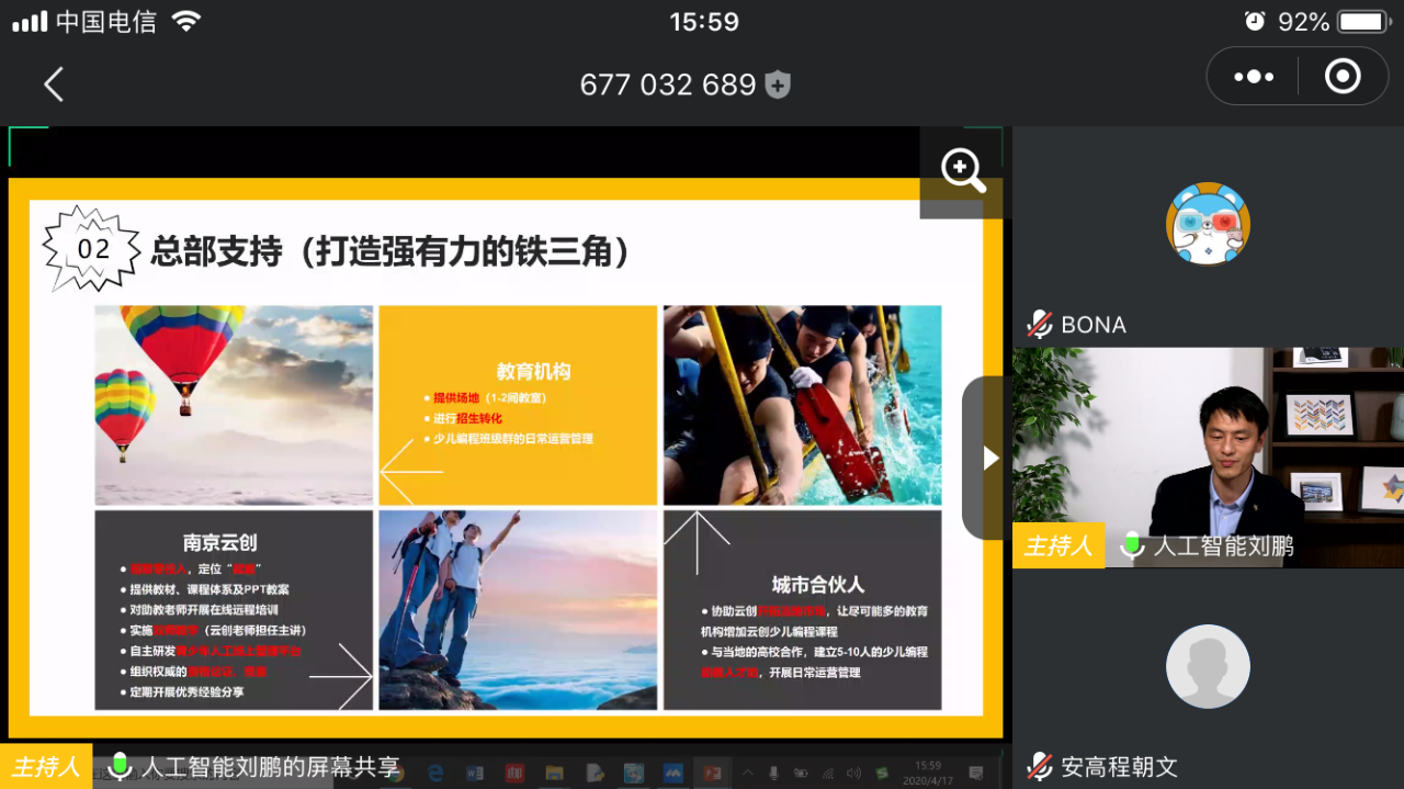 在与城市合伙人代表交流互动环节,刘鹏教授、汤鹏经理在直播间回答了参会代表的相关疑问。大家结合自己所在城市、培训机构或企业的实际情况,就市场前景、合作模式等与云创方面进行了交流,为此大家也坚定了成为云创青少年人工智能学院合伙人的信心。